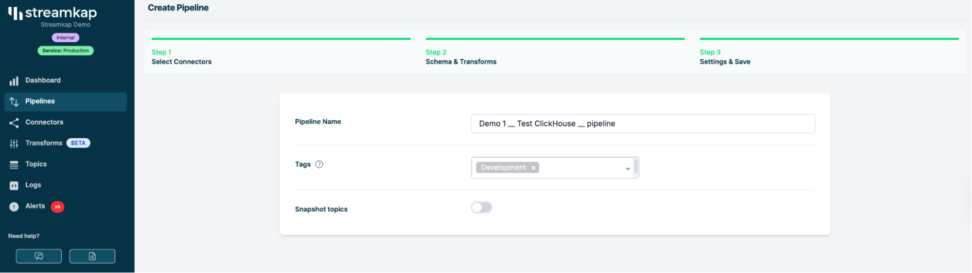 Шаг 3: Настройка конвейера в Streamkap
